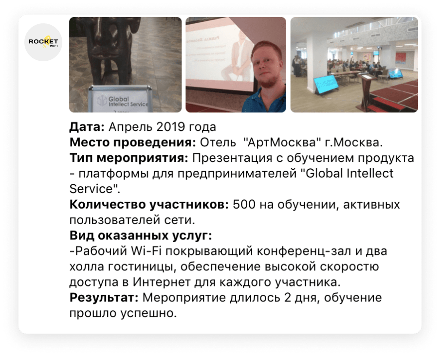 WiFi-сеть - это предоставляемая возможность подключения беспроводным способом, то есть по WiFi, к каким-либо ресурсам. Обычно это включает доступ в Интернет, но так бывает не всегда. У нас есть кейсы, когда заказчик на мероприятии разворачивал внутренний ресурс (сайт) и нужно было дать пользователям возможность подключаться к WiFi, чтобы видеть этот сайт. В этом случае Интернет-канал мы не делали, сайт располагался локально.